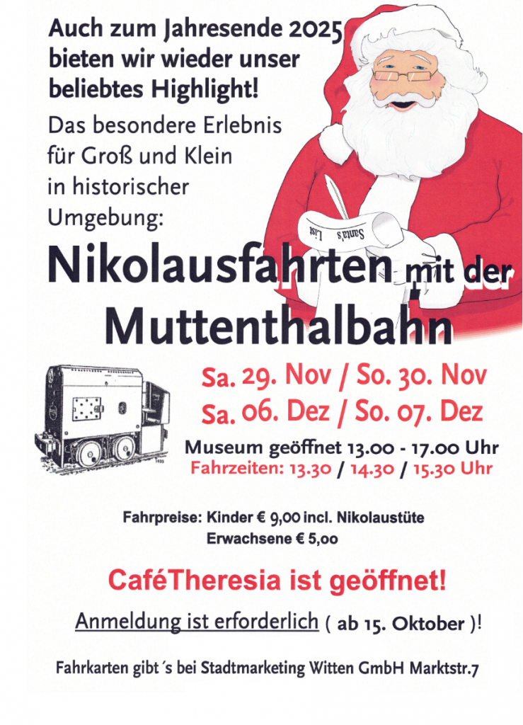 Ihr Domizil hat die Arbeitsgemeinschaft Muttenthalbahn e.V. seit 1989 unterhalb des „Schloss Steinhausen“ in Witten-Bommern, in direkter Nähe zur Ruhr. Das Gelände gehörte zu der bereits im Jahre 1892 stillgelegten Zeche Theresia, einer Zeche des frühen Steinkohlebergbaus südlich der Ruhr. Die denkmalgeschützten Betriebsgebäude der ehemaligen Zeche wurden von unserem Verein saniert und bieten nun eine geeignete Heimat für das Museum.
